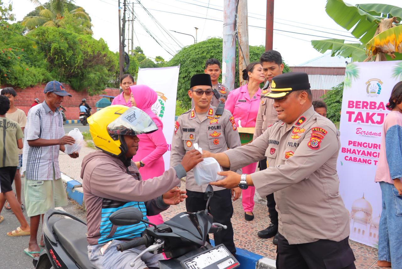 TUAL, Kepala Kepolisian Resor Tual AKBP Whansi Des Asmoro, S.H., S.I.K., bersama Ketua Bhayangkari Cabang Tual, Wakapolres Tual dan Para Pju Polres Tual melaksanakan kegiatan pembagian takjil dan Sembako kepada pengendara yang melintas di Simpang Kawasan Bundaran (SKB) Kota Tual.